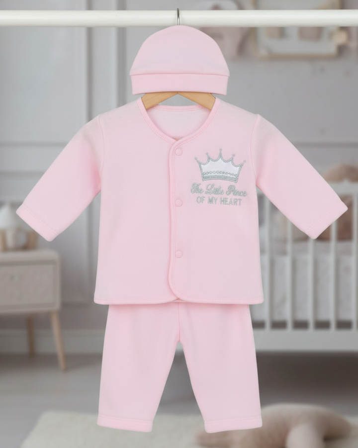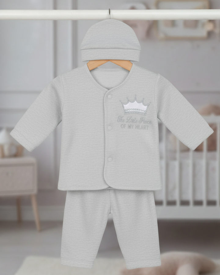Introducing our 3-Piece Prince Starter Set for Newborns! Included are a shirt, trousers and cap - all made with warm and cozy polar fabric. Get ready for your new arrival with these essential pieces that will keep your little one comfortable and stylish.