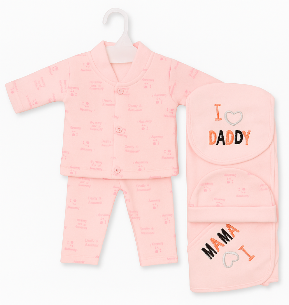 Get ready for your new arrival with our 5pcs Love Mama Daddy Starter Set! This set includes a shirt, trousers, wrapping sheet, cap, and bib - everything you need for your new born baby. Made with warm, comfortable polar fabric, your little one will feel cozy and loved in these essential pieces.