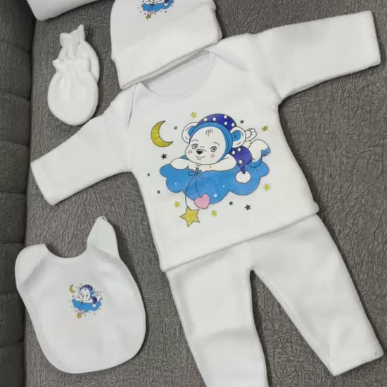 Dress your newborn in style with our 7 piece white winter outfit, complete with shirt, trouser, blanket, 2x mittens, 1 hat, and 1 bib. Keep them warm and cozy during the colder months. Perfect for babies 0-3 months, this outfit is a must-have for any new parent.