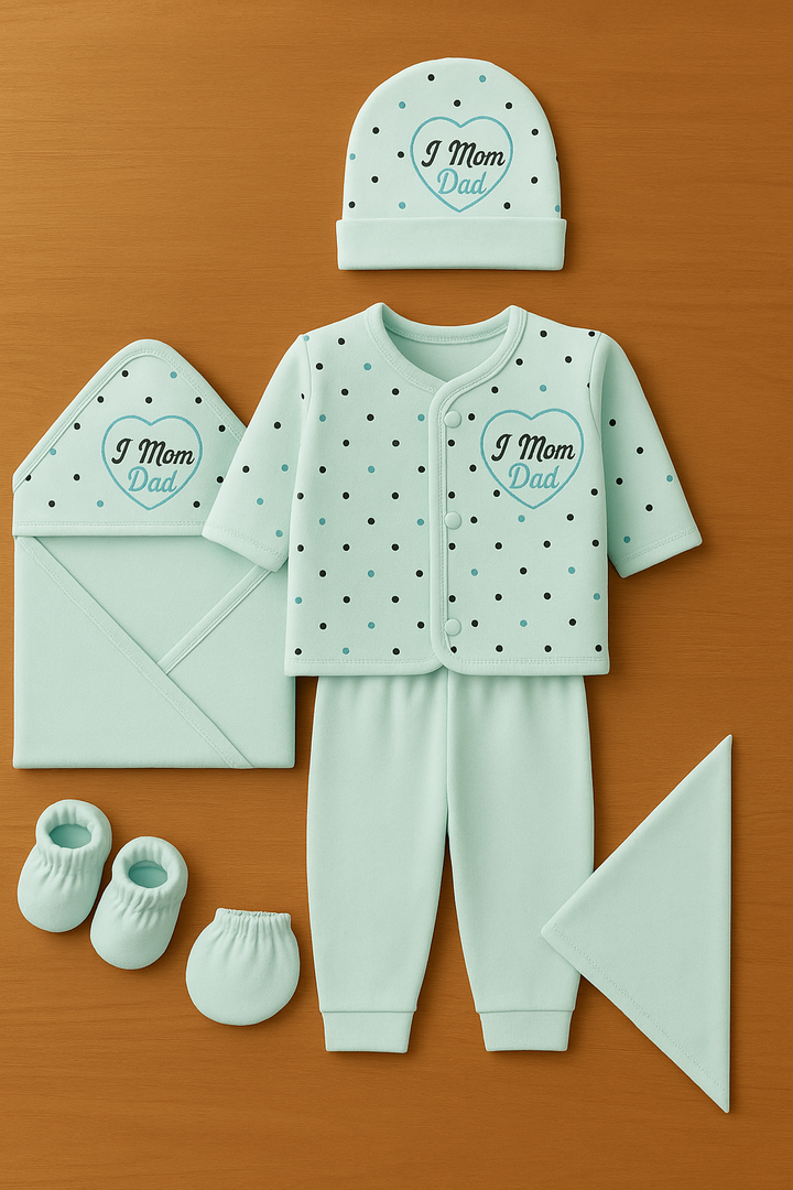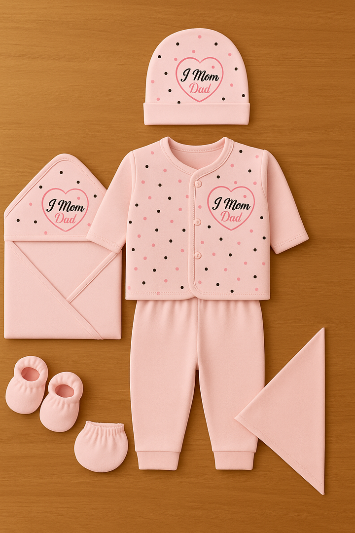 Wrap your little one in comfort and love with our adorable 8-piece "I ❤️ Mom Dad" newborn set. Crafted from soft, breathable cotton, this set is perfect for keeping your baby cozy all day long. Featuring a mix of playful polka dots and heart prints, it’s as cute as it is practical.