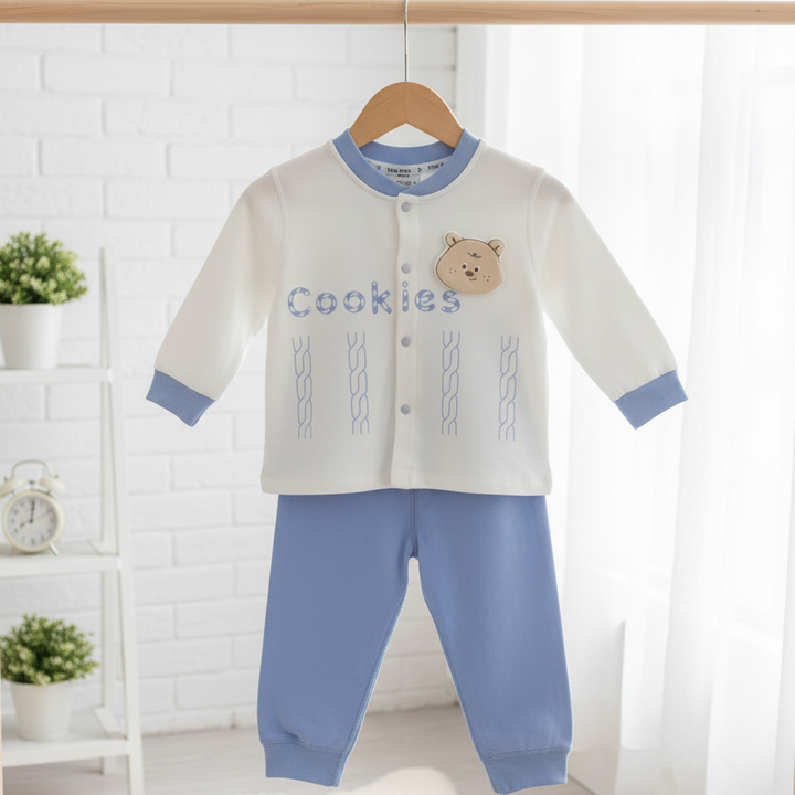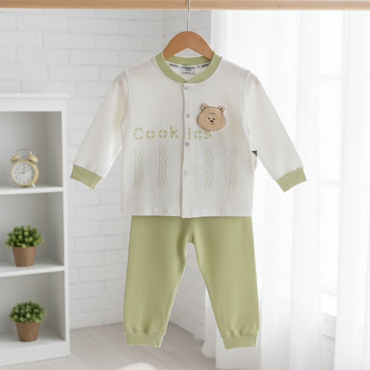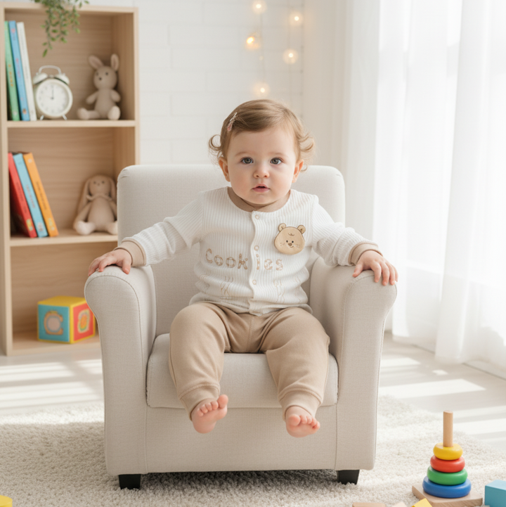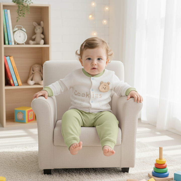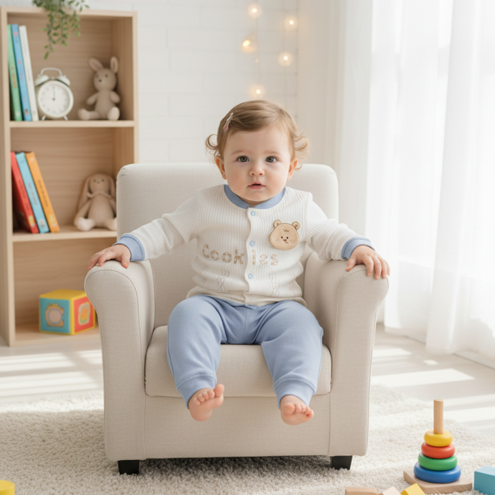 This sweet set is an essential for any baby's wardrobe! It includes a cream-colored, ribbed cardigan accented with a delightful teddy bear detail and complementary beige bottoms. The soft, breathable fabric ensures all-day comfort for your 9-12 month old. Ideal for a cozy play date or an everyday look.