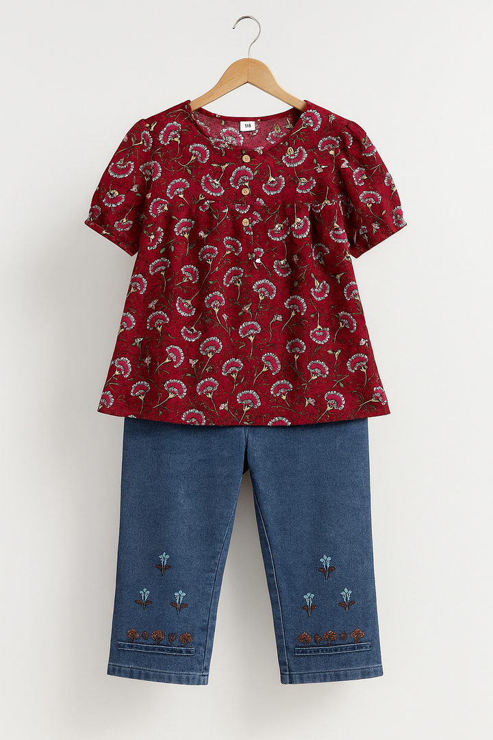 Dress your little one in effortless charm with this adorable two-piece outfit. Featuring a vibrant maroon floral printed top with wooden button details and puff sleeves, paired with comfy blue denim pants adorned with delicate floral embroidery. Perfect for casual outings, family gatherings, or playdates – this outfit blends comfort with cuteness! 💕✨