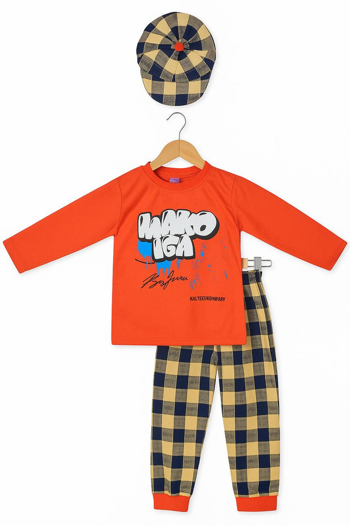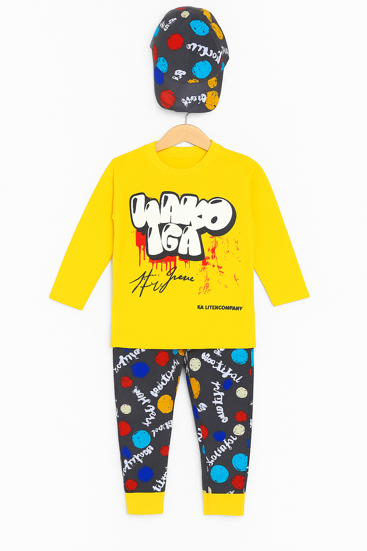 Add some street-style vibes to your little one’s wardrobe! This 3-piece set includes a vibrant yellow long-sleeve graffiti print top, fun jogger pants with colorful splashes, and a matching cap for the ultimate cool look. Perfect for active kids who love to stand out in style!
